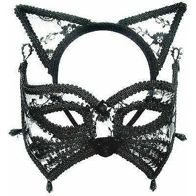 Black cat mask with easrs, the mask is attached to a headband and can be raised on to the top of your head like a pair on sunglasses. Fantastic for Masquerade balls and fancy dress parties