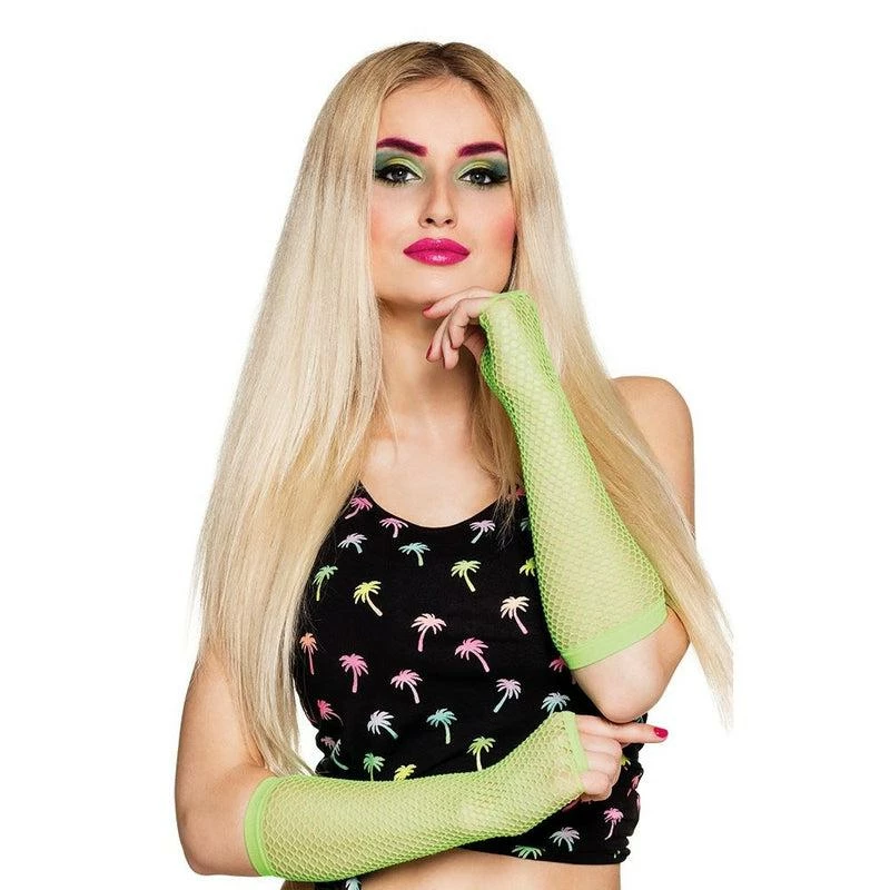 Ladies Neon mesh elbow length gloves. A great accessory for any 80s or pop star themed fancy dress costume.