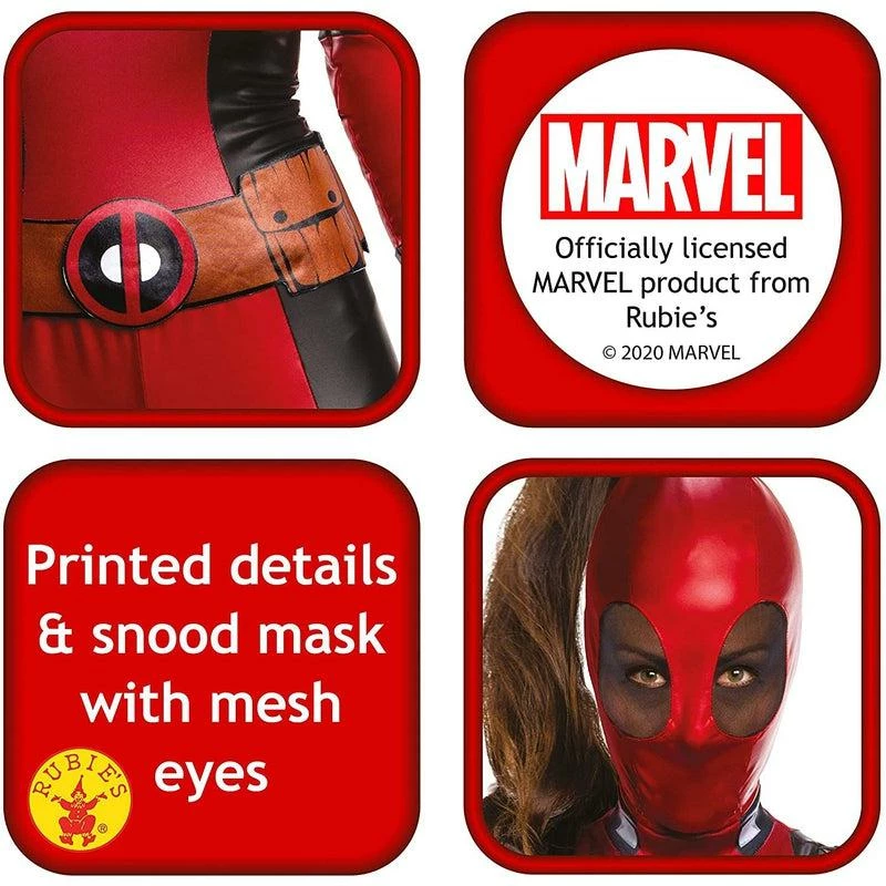 Rubie’s Official Deadpool Ladies Costume from the Secret Wishes Range - Costume includes Printed Black and Red Cat suit with Back fastener. Fabric Belt with Deadpool Logo. Snood/mask with hole in the top for your hair.
