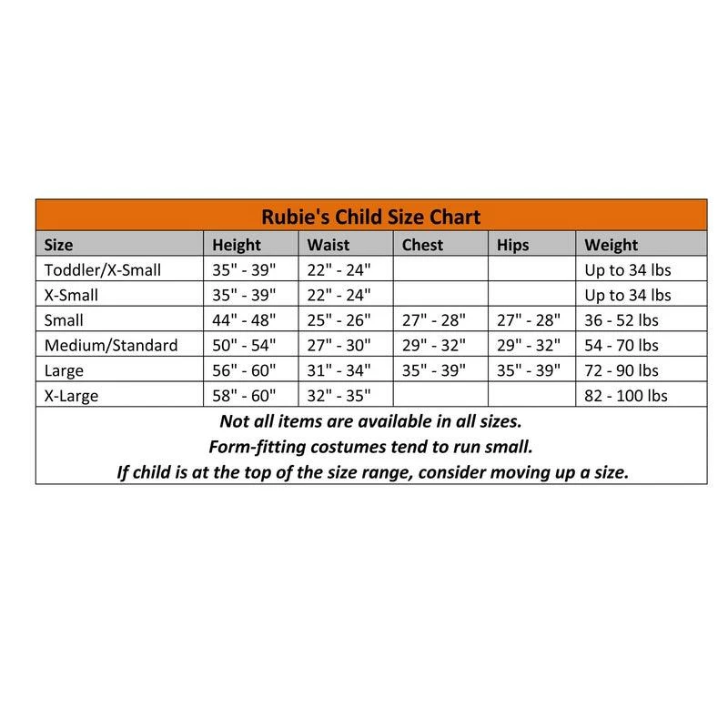 Costumes are sized differently than apparel, use the Rubies Child Size Chart image